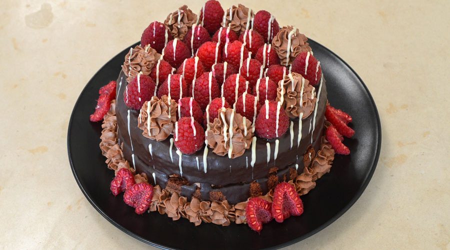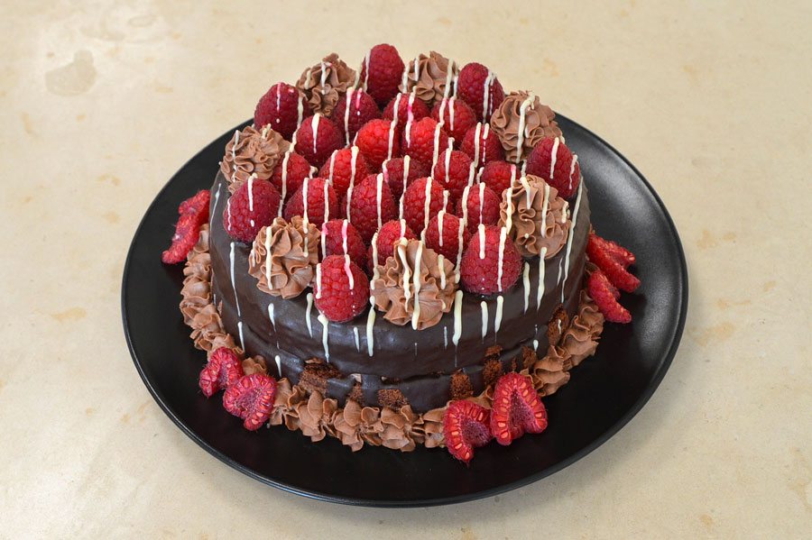 Tagliare la torta a metà,bagnarla con la bagna al caffè amaro, farcirla con la namelaka. Ricoprire la torta con la glassa fondente,decorarla con Namelaka, lamponi e cioccolato bianco