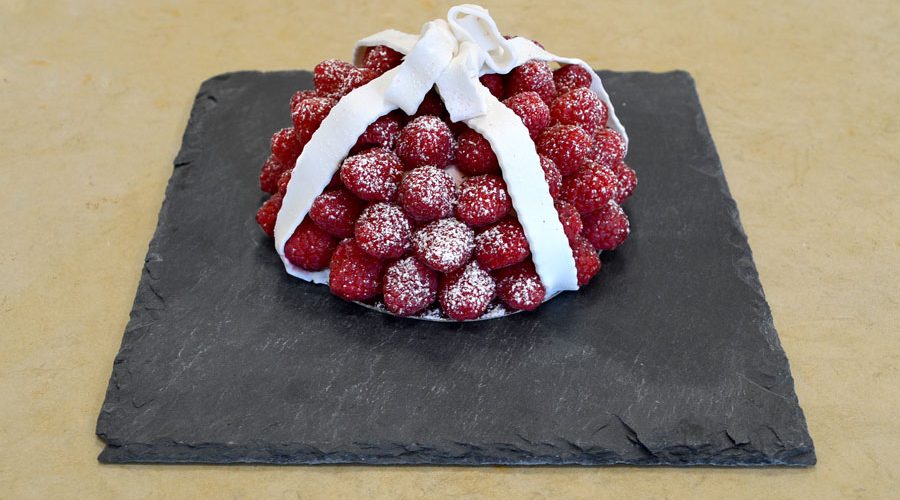 Tagliare il pan di spagna. Stendere la suprema e farcire con lamponi freschi. Chiudere il dolce con gateaux e decorare con lamponi, pasta di zucchero e zucchero a velo. Decorare il tutto con creatività.