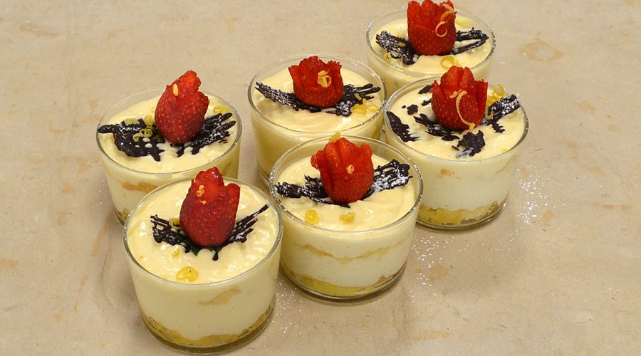 Prendere il pan di spagna copparlo con un coppa pasta medio , tagliarlo in tre parti e  cominciare ad assemblare il dolce. Prendere dei bicchieri di vetro, mettere alla base un cerchio di pan di spagna bagnato con acqua e zucchero, fare uno strato di crema al limone, poi nuovamente pan di spagna, crema ed in fine per guarnire zucchero a velo e un ramo di ribes rossi.