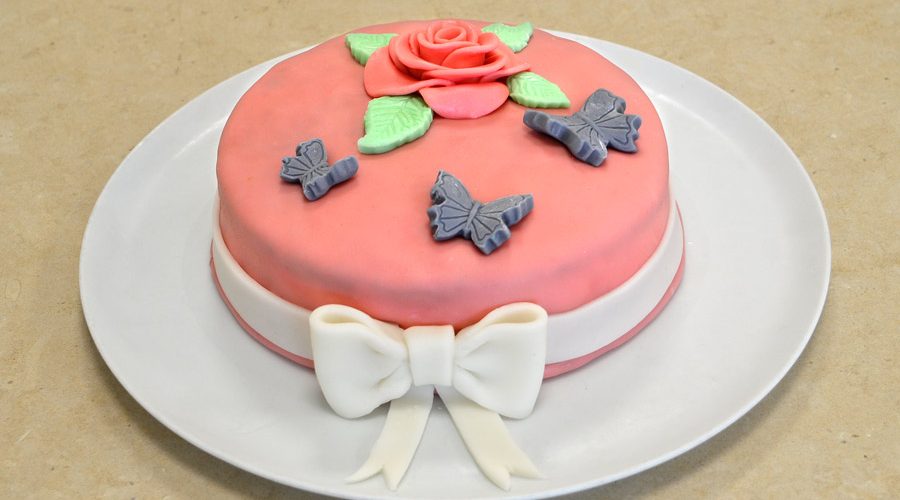 - 30 minuti per la copertura con pasta da zucchero, costruzione di rose, foglie e farfalle e di un fiocco alla base.