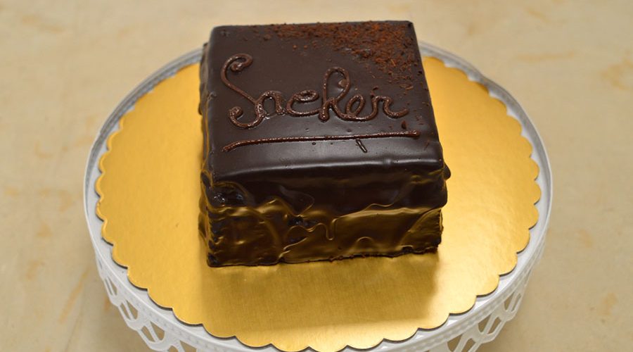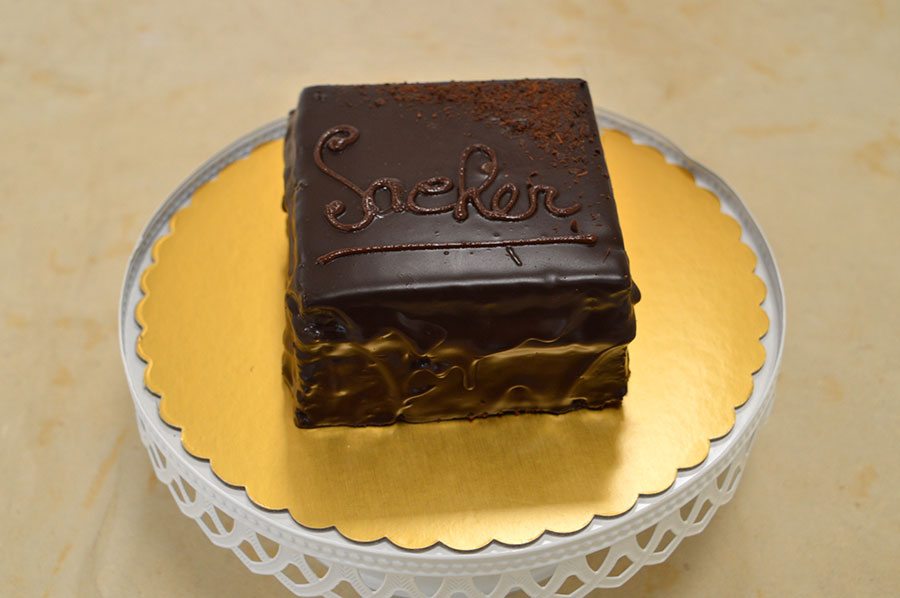 Per la decorazione finale , ovvero la classica scritta “Sacher” , si può utilizzare lo stesso cioccolato della copertura oppure optare per un cioccolato dal colore differente così da far risaltare la scritta , tutto ciò è una scelta totalmente personale . Scaldare la cioccolata in questione e usare un sac à poche per effettuare la scritta .