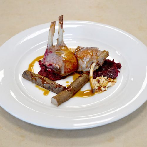 Per preparare il carrè iniziamo con metterlo sotto vuoto, una volta sottovuotato lo cuociamo nel roner a 55 gradi per un’ora in modo da cuocere leggermente la carne ma facendo rimanere tutti i succhi all’interno della fibra. successivamente poi andremo a rosolarlo in padella per poi finirlo in forno per circa 4/6 in base alla dimensione del carrè. Nel frattempo che il carrè cuoce passiamo a preparare la scorzonera, questa va, per prima cosa, lavata sotto l’acqua per togliere la terra, una volta pulita la andiamo ad avvolgere con della stagnola per poi cuocerla in forno a 170 gradi per circa 20 minuti. Ora ci occupiamo delle nocciole, le schiacciamo e le tostiamo in forno a 170 gradi per 5/7 minuti. In fine frulliamo la barbabietola, dopo averla sbucciata, in un mixer fino a quando non diventa una crema liscia.