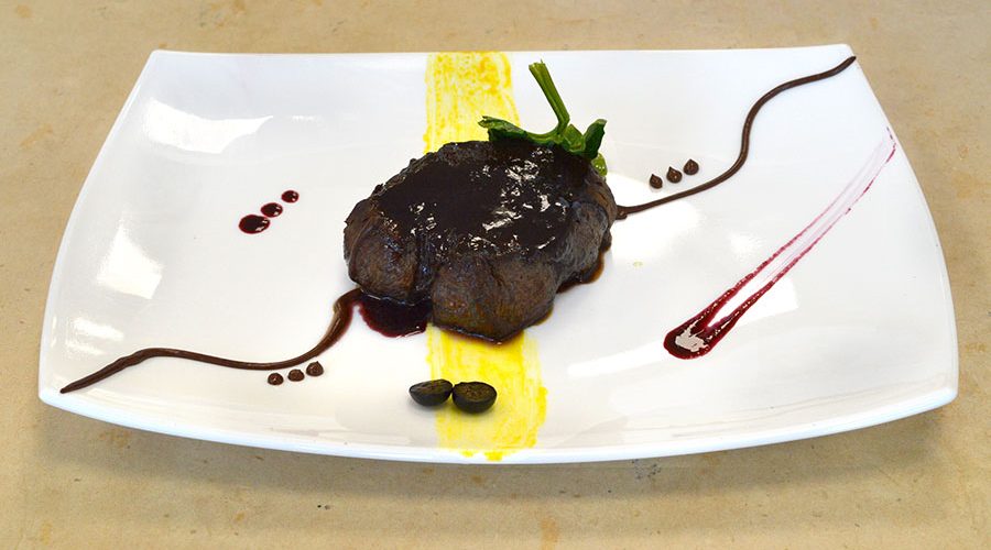 In un piatto da portata fate una striscia centrale con l’aiuto di un pennello da cucina precedentemente bagnato con la riduzione di zafferano, al centro del piatto mettete la mouse di cioccolato fondente e ponetevi sopra il filetto, per finire guarnite con crema di mirtilli.