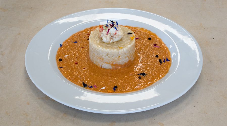 A cottura ultimata, versare sul fondo del piatto un po’ di bisque e adagiarvi la crema di riso con l’aiuto di un coppapasta insieme all’Astice cotto in olio cottura. Guarnire il piatto con dei petali di fiori commestibili o con del prezzemolo tritato finemente e dei grani di pepe nero e rosso.