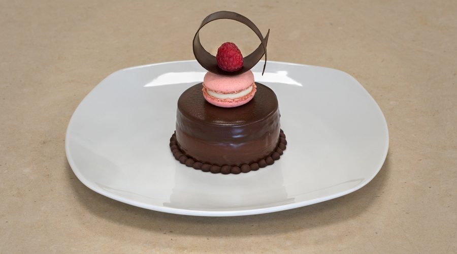 Mettere il dolce ricoperto sul piatto da portata. Appoggiarci sopra, al centro, un macaron (per farlo attaccare possiamo aiutarci con la ganache recuperata dalla teglia e messa in una sac à poche con una bocchetta piccola). Staccare i triangoli di cioccolato arrotolati e appoggiarne uno sopra ogni macaron. Sopra il cioccolato appoggiarci un lampone fresco.