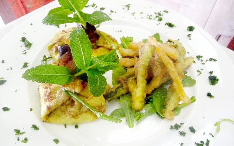 Pulire le orate, sfilettarle e tagliarle a cubetti. Cuocere in padella con soffritto di cipolle e prezzemolo per 10/15 minuti. A fine cottura, aggiungere la menta tritata e la panna da cucina. Scaldare una padella e mettere 1/2 mestoli di pastella. fare le crèpes e riempirle con il composto di orata. Chiudere il tutto “a fagottino”, legando con dei gambi di prezzemolo precedentemente scottati in acqua bollente. Mettere in forno a 180 gradi per 4/5 minuti e servire ben caldi. Impiattare con il contorno di tempura di carote e zucchine.