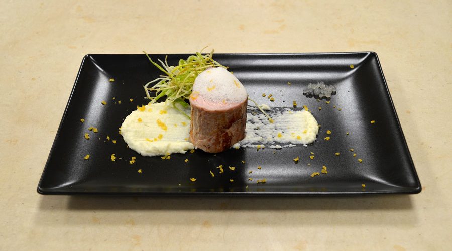 Adagiare un letto di cavolfiore, appoggiare il filetto nel centro, decorare con spuma e perle, avvicinare un nido di porri fritti.