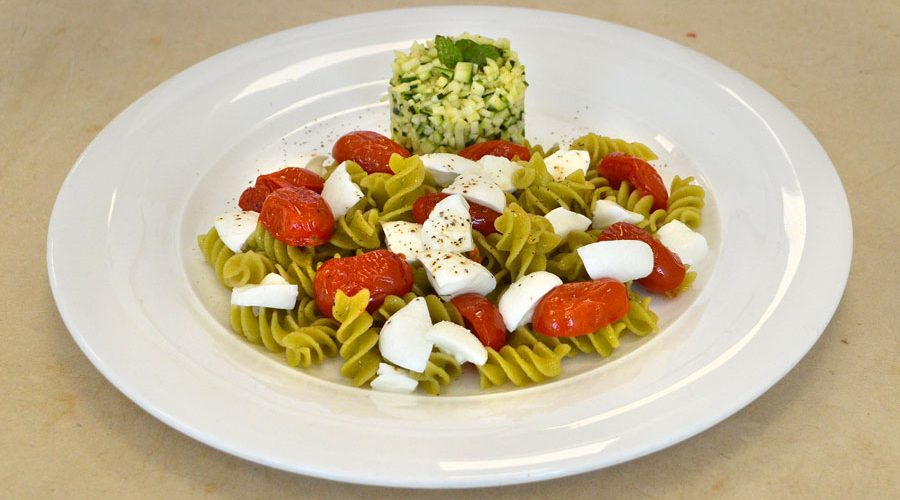 Quando i pomodorini saranno caramellati rimuoverli dalla padella, nella quale si salterà la pasta aggiungendo, se necessario, un filo d’olio. Coppare la tartare con un coppapasta di diametro 5cm e la pasta con uno di diametro 10 cm. Decorare la tartare con una fogliolina di menta e disporre i pomodorini e le ciliegine di mozzarella, precedentemente scolate, sulla pasta. Guarnire il piatto con del pepe nero e servire tiepido.
