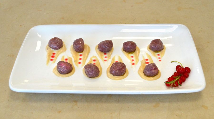 Mentre le patate stanno bollendo preparare il ribes togliendo i semi. Per la riduzione di ribes , in un pentolino porre i ribes e 2 cucchiai di acqua, frullare con il minipimer, filtrare il liquido e metter sul fuoco medio fino a che non si addensa ( vela il cucchiaio). Olio alla cipolla scaldare ½ cipolla tagliata fine in abbondante olio e lasciarla riposare 2 ore , filtrare l’olio. La ricetta non comporta difficoltà particolari eccetto che per il delicato passaggio dell’inserimento del ripieno nello gnocco, in quanto, se non chiuso bene, durante la cottura potrebbe aprirsi vanificando il piatto.