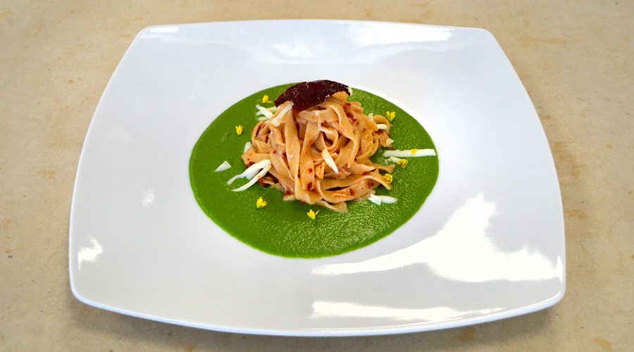 Per l’impiattamento, disponete sul fondo la crema di cime di rapa, formate un nido con le tagliatelle ed adagiatelo sulla crema, guarnite a piacere.