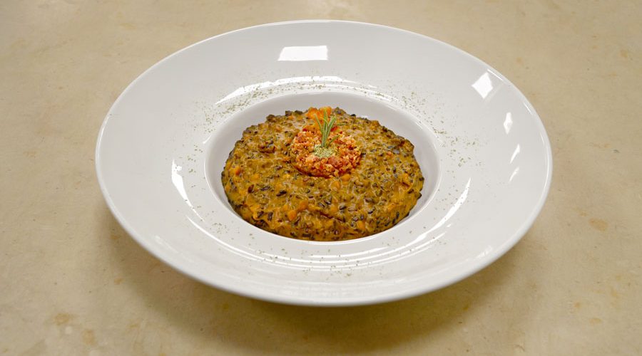 Tempi di realizzazione: Brodo vegetale circa 1h preparazione + cottura; Crema di zucca 1h preparazione + cottura; Zucca a mirepoix 15′ min.; Riso venere circa 45 min preparazione + cottura; Pancetta circa 5 min.
