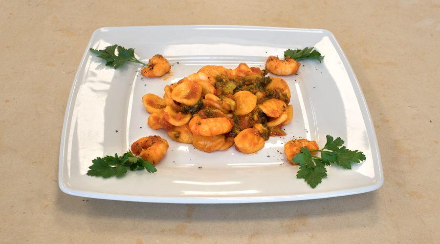 Prima di tutto bisogno cuocere i broccoli, la classica cottura con acqua e un goccio d’olio va più che bene, per i gamberi invece usare un pizzico di vino, olio e sale quanto basta, stando attenti a non farli indurire. In secondo luogo invece cuocere le orecchiette fresce per 5-10 minuti (dipende dal tipo di orecchiette). Togliere leggermente prima della fine della cottura le orecchiette e metterle in padella insieme alla salsa di pomodoro, far rosolare il sugo e poi aggiungere i broccoli e i gamberi pronti, mescolare il tutto e far finire di cuocere un paio di minuti. Appena pronto il tutto, servire nel piatto e decorare a piacere prima di portare il primo al tavolo.