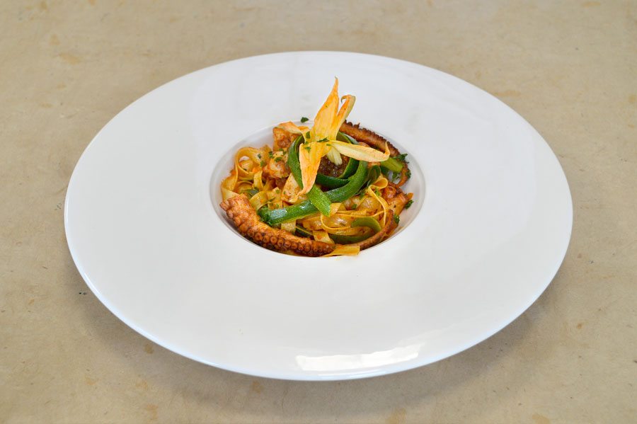 CORSO DI CUCINA | PRIMO PIATTO TAGLIATELLE FIORITE AL POLPO DI FEDERICO CLERICI DIPLOMATO CORSO DI CUOCO PROFESSIONISTA INGREDIENTI PER 4 PERSONE: Ingredienti per il piatto: – 800 g polpo fresco – 1 spicchio di