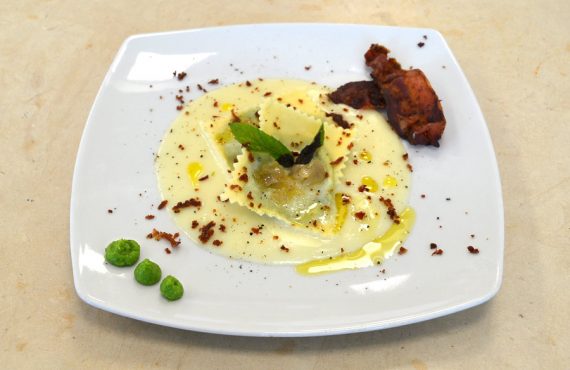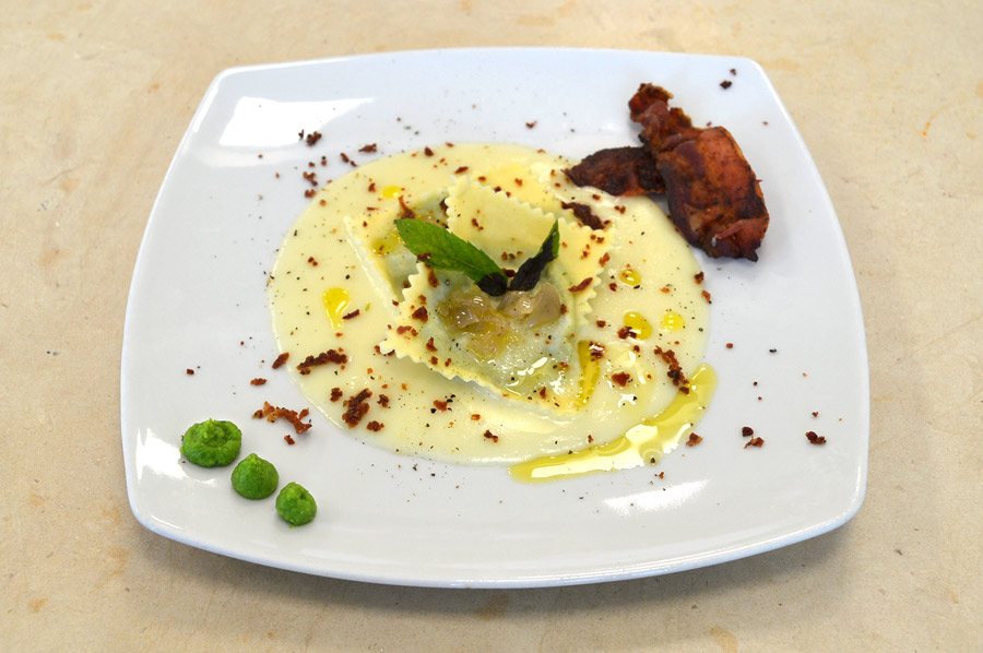 CORSO CUCINA | PRIMO PIATTO RAVIOLI DI GRANO DURO AI PISELLI E MENTA SU CREMA DI PECORINO DI PIENZA E CIPOLLA DI TROPEA BRASATA CON BRICIOLE DI PANCETTA CROCCANTE. DI RAFFAELLA COVA DIPLOMATA