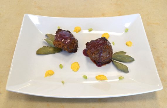 SPEZZZATINO DI MANZO IN CROSTA DI PISTACCHI CON SALSA AL VINO ROSSO