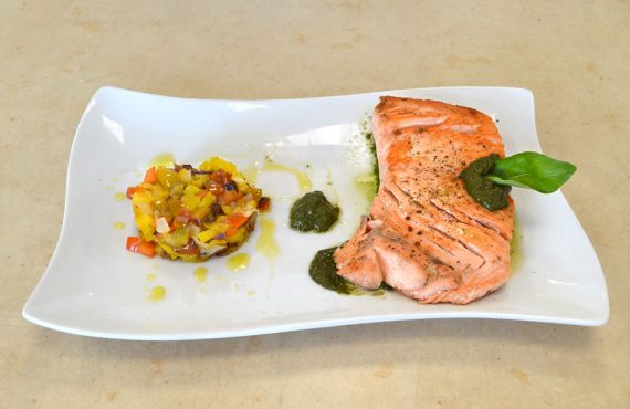 CORSO CUCINA | SECONDO PIATTO SALMONE CON UNA SALSA AL BASILICO E PARMIGIANO DI GIANLUCA DE DOMINICIS DIPLOMATO CORSO DI CUOCO PROFESSIONISTA INGREDIENTI PER 4 PERSONE: Ingredienti base: – 800g di filetto