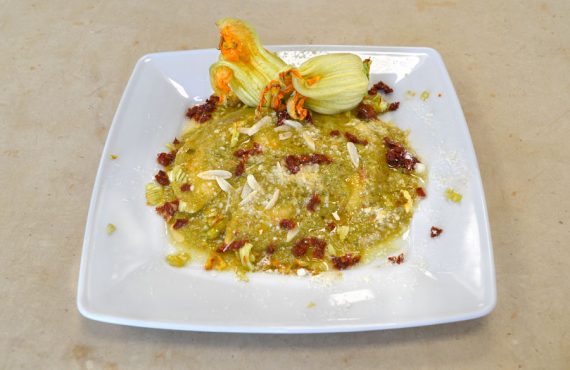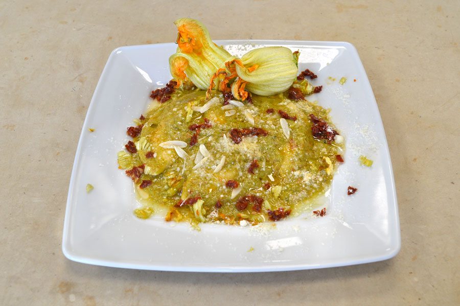 MEZZELUNE AL CAPRINO IN VELLUTATA DI ZUCCHINE E POMODORI SECCHI