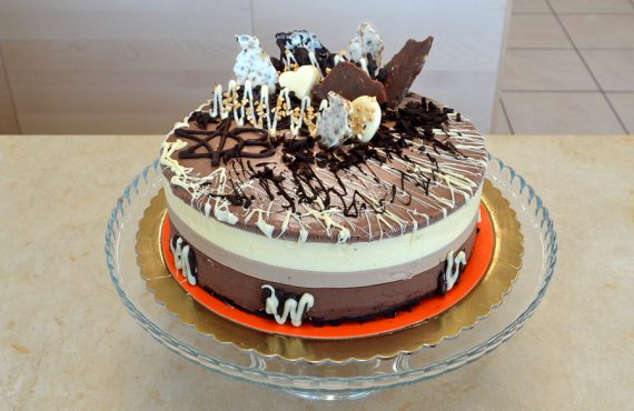 CORSO DI PASTICCERE | DESSERT TORTA TRIONFO DI CIOCCOLATI BIANCO AL LATTE E FONDENTE DI DANIELA BERTELLI DIPLOMATA CORSO DI PASTICCERE PROFESSIONISTA INGREDIENTI: Per le tre bavaresi: – 400g di latte