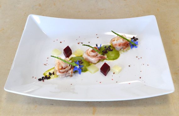 CORSO DI CUOCO | SECONDO PIATTO SPIGOLA MARINATA AL PEPE ROSA CON CREMA DI PISELLI ALLA MENTA GELÈE DI LAMPONE E ZENZERO, RISO VENERE CROCCANTE E ASPARAGO DI MARE DI GIULIO ASCIUTTO DIPLOMATO CORSO