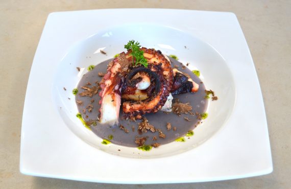 CORSO CHEF | SECONDO PIATTO POLPO CROCCANTE SU VELLUTATA DI PATATE VIOLA E TARTUFO DI FERRARA YURI DIPLOMATO CORSO DI CUOCO PROFESSIONISTA INGREDIENTI PER 4 PERSONE: Ingredienti per la decorazione: – sale – olio –