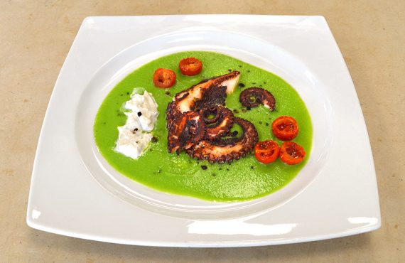 CORSO CUOCO| SECONDO PIATTO POLPO ROSTICCIATO CON CREMA DI PISELLI E STRACCETTI DI BURRATA DI MARCO FARINA DIPLOMATO CORSO DI CUOCO PROFESSIONISTA INGREDIENTI PER 4 PERSONE: