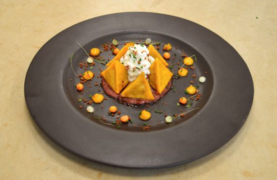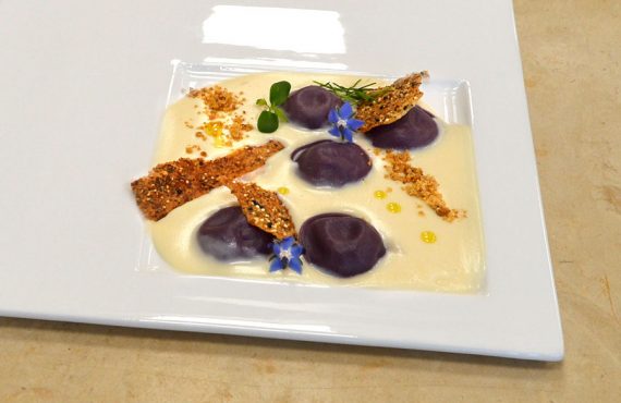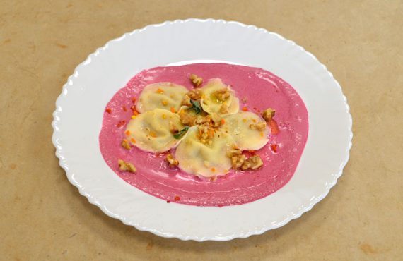 CORSO CUOCO | PRIMO PIATTO RAVIOLI SU CREMA DI BARBABIETOLA E FORMAGGIO DI SILVIA PELUFFO DIPLOMATA CORSO DI CUOCO PROFESSIONISTA INGREDIENTI PER 4 PERSONE: Ingredienti per la pasta all’uovo: –