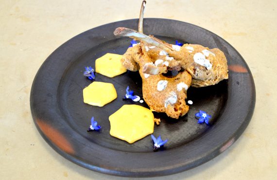 AGNELLO MARINATO ALLE SPEZIE E MENTA IN TEMPURA SPUMA DI PATATA ROSSA E SALSA YOGURT ALLA MENTA