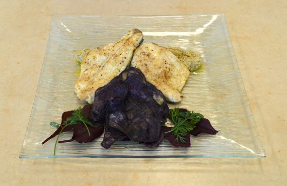 CORSO CHEF PROFESSIONISTA | SECONDO PIATTO FILETTO DI BRANZINO CON PATE’ DI CARCIOFO VIOLETTO TOSCANO IGP E CHIPS DI PATATE VIOLA DI HAKIM ZERIANI DIPLOMATO CORSO CHEF PROFESSIONISTA INGREDIENTI PER 4 PERSONE: – 4