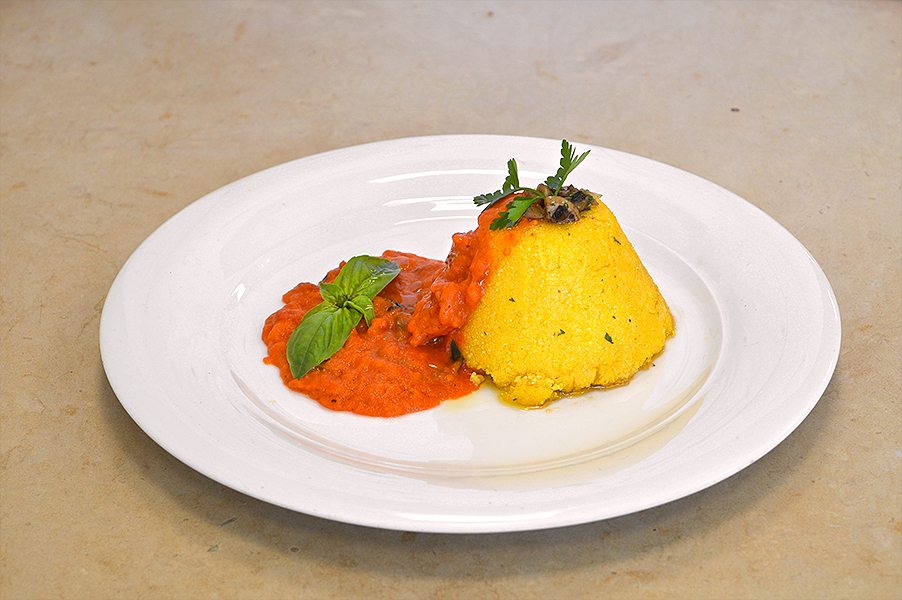 CORSO CUCINA | PIATTO UNICO VULCANETTO DI POLENTA RIPIENO CON FUNGHI SU VELLUTATA DI POMODORINI FRESCHI DI VALERIO NARDI DIPLOMATO CORSO DI CUOCO PROFESSIONISTA INGREDIENTI PER 4 PERSONE: –