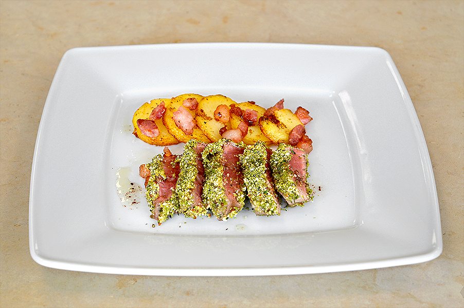 CORSO CUOCO | SECONDO PIATTO FILETTO IMPANATO ALLE ERBE CON PATATE E GUANCIALE DI GIORGIO AMBROSINI DIPLOMATA CORSO DI CUOCO PROFESSIONISTA INGREDIENTI PER 4 PERSONE: – 4 fette di filetto da