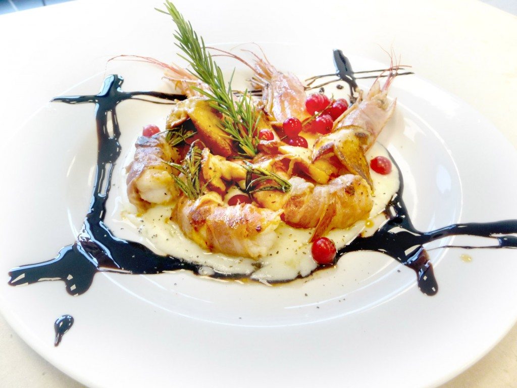 CORSO DI CUOCO | SECONDO PIATTO GAMBERI AL BACON E PORCINI SU MOUSSE DI PATATE E PORRI PROFUMATI AL RIBES DI CARLOTTA DELICATO DIPLOMATA CORSO DI CUOCO PROFESSIONISTA INGREDIENTI PER 4