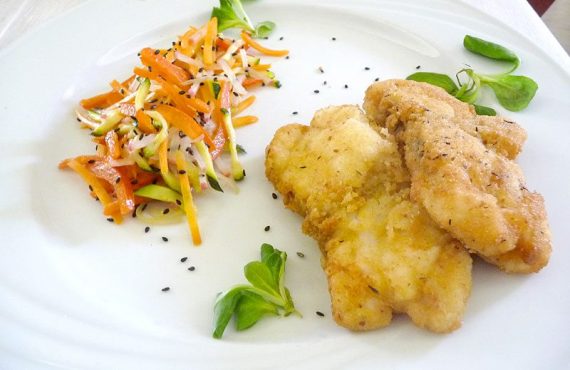 SECONDO PIATTO E CONTORNO CORSO CUCINA | MEDAGLIONI FRITTI DI RANA PESCATRICE AL TIMO CON INSALATA PERUVIANA Ingredienti per 4 persone Ingredienti per i medaglioni di rana pescatrice – 8 medaglioni di pescatrice – 150 gr di pan grattato – 200 gr