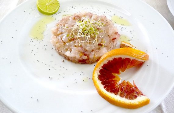 ANTIPASTO CORSO CUCINA | TARTARE DI TRIGLIA DI SCOGLIO AGLI AGRUMI Ingredienti per 4 persone – 4 triglie di scoglio grandi – 1 lime – sale – olio evo – capperi – germogli di soia – semi di papavero PROCEDIMENTO PER LA PREPARAZIONE Sfilettare le triglie e