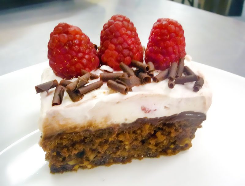 DESSERT CORSO PASTICCERE | BROWNIES CON CREMA DI MASCARPONE E LAMPONI Ingredienti – 200 gr di cioccolato fondente – 75 g di farina – 100 gr di nocciole tritate – 1 cucchiaio di cacao in polvere – 1 bustina di lievito – 125 gr di