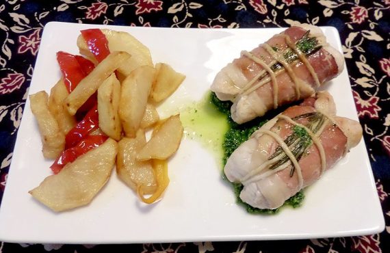 SECONDO PIATTO E CONTORNO CORSO DI CUOCO | INVOLTINI DI POLLO E SPECK CON CONTORNO DI PEPERONI E PATATE Ingredienti per 4 persone Ingredienti per gli involtini di pollo e speck – 4 fette di petto pollo – 4 fette di