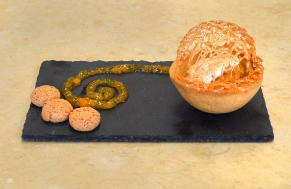 CORSO DI PASTICCERE PROFESSIONISTA | DESSERT DOLCE CON CIOCCOLATO, CARAMELLO, PESCA E MOUSSE DI AMARETTI DI LAURA PASSERA DIPLOMATA DEL CORSO DI PASTICCERE PROFESSIONISTA INGREDIENTI