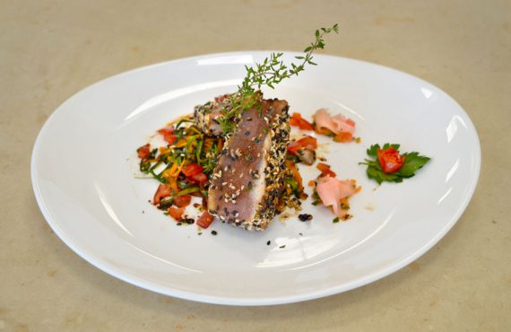 FILETTO DI TONNO AL SESAMO, CAROTE E ZUCCHINE JULIENNE