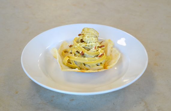 CORSO DI CUCINA PROFESSIONALE | PRIMO PIATTO PASTA DI MELANZANE E MANDORLE SU UN CESTINO DI PARMIGIANO DI CORRADO DI PIETRO DIPLOMATO DEL CORSO DI CUCINA