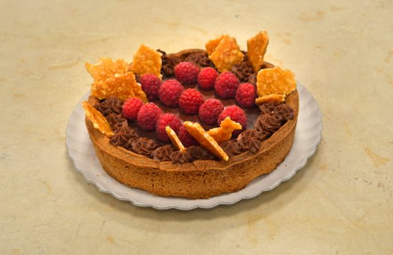 TORTA CIOCCOLATO FONDENTE, E LAMPONI CON CROCCANTE DI ARACHIDI
