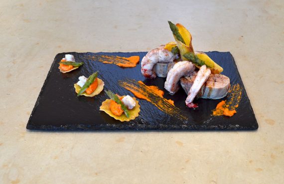 CORSO PROFESSIONALE DI CHEF | SECONDO PIATTO GAMBERONI SU FILETTO DI MAIALINO CON CROCCANTE DI MAIS, PUNTE DI ASPARAGI E MOUSSE SAPORITA AI PEPERONI. DI