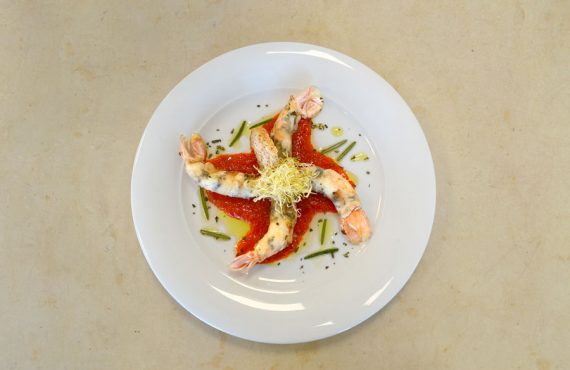 CORSO DI CUOCO PROFESSIONISTA | SECONDO PIATTO CODE DI SCAMPI IN VESTE DI LARDO AL RAMERINO SU CREMA DI PEPERONE AL MIELE DI ANDREA TASSONI DIPLOMATO DEL