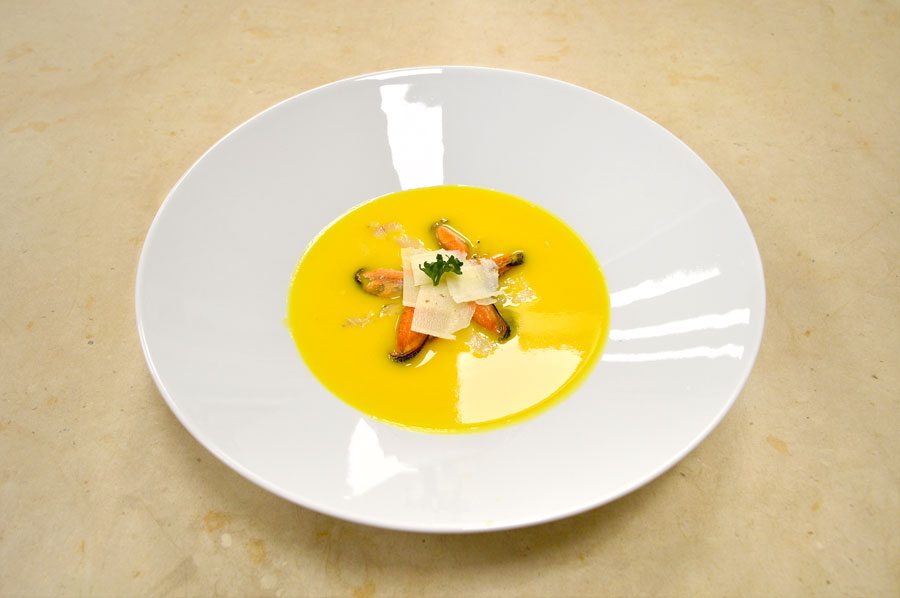 RICETTA DEL CORSO PROFESSIONALE DI CHEF | ANTIPASTO VELLUTATA DI PATATE ALLO ZAFFERANO CON COZZE, LARDO D’ANARD E PECORINO ROMANO DI ANTONY FRANCO DIPLOMATO AL CORSO PROFESSIONALE DI CHEF INGREDIENTI PER