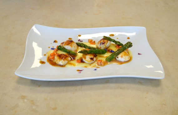 CAPESANTE CON CORALLO SCOTTATI SU CREMA ACIDA DI PATATE, ASPARAGI E BISQUE.
