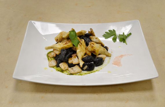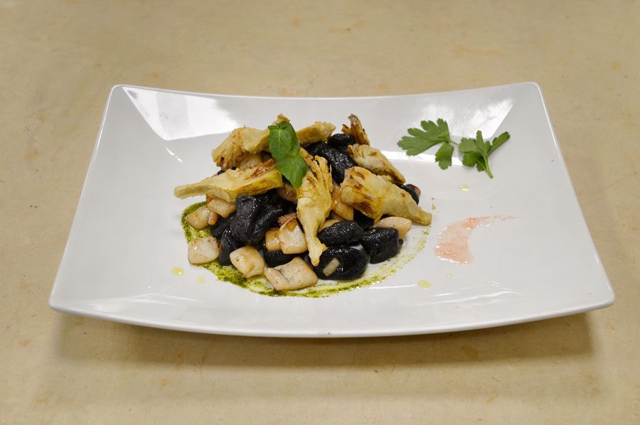 CORSO DI CUOCO PROFESSIONISTA | PRIMO PIATTO GNOCCHI CON NERO DI SEPPIA E CARCIOFI FRITTI DI DARIO LA ROSA DIPLOMATO DEL CORSO DI CUOCO PROFESSIONISTA INGREDIENTI PER 4 PERSONE: – mezza cipolla –
