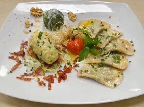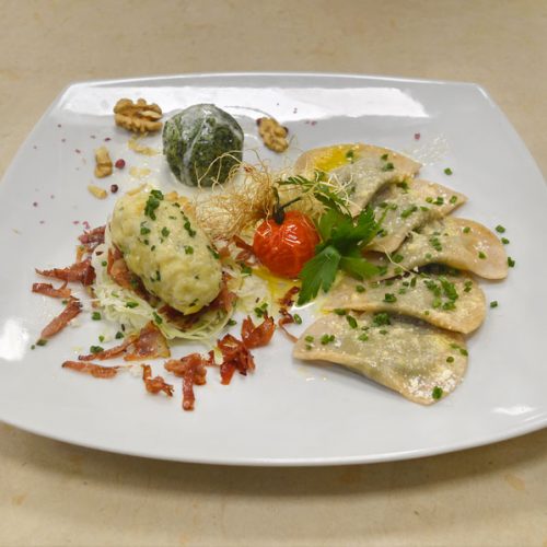 CORSO PER DIVENTARE CUOCO | PRIMO PIATTO TRIS TIROLESE DI BASHANTI MONETA DIPLOMATA CORSO DI CUOCO PROFESSIONISTA INGREDIENTI PER 4 PERSONE: Ingredienti per le mezzelune tirolesi: Per la pasta: – 150