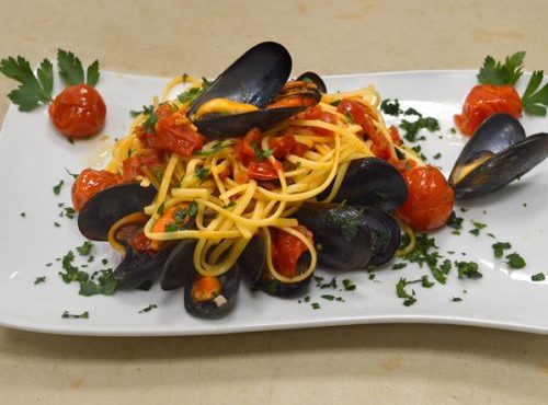 CORSO PER CUOCO PROFESSIONISTA | PRIMO PIATTO NOSTALGIA DI KUJIM RROJI DIPLOMATO CORSO DI CUOCO PROFESSIONISTA INGREDIENTI PER 4 PERSONE: – Linguine 400gr – Cozze 500gr – Pomodorini Pachino 400gr – 2 spicchi d’aglio – peperoncino