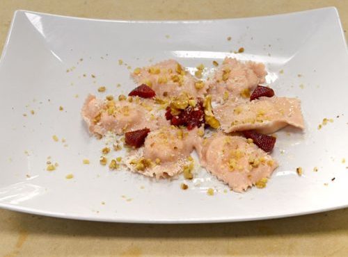 CORSO DI CUOCO | PRIMO PIATTO RAVIOLI DI BARBABIETOLA RIPIENI DI RICOTTA E GORGONZOLA, SERVITI CON BURRO SFUSO E NOCI PESTATE DI SARA RUSCONI DIPLOMATA CORSO DI CUOCO PROFESSIONISTA INGREDIENTI PER 4 PERSONE: