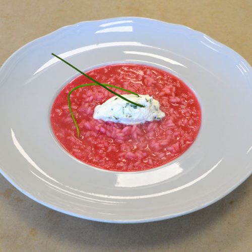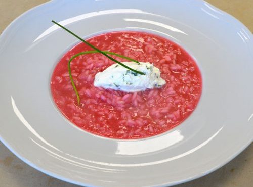 CORSO PER DIVENTARE CUOCO | PRIMO PIATTO RISO ALLE RAPE ROSSE CON FORMAGGIO CAPRINO E ERBA CIPOLLINA DI PAOLA BOSCHI DIPLOMATA CORSO DI CUOCO PROFESSIONISTA INGREDIENTI PER 4 PERSONE: – 280 g