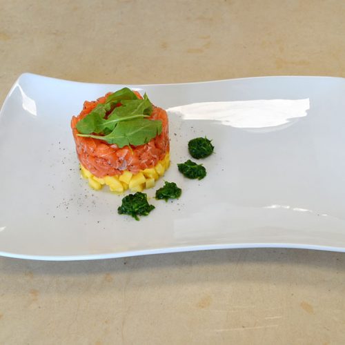 CORSO DI CUOCO PROFESSIONISTA | SECONDO PIATTO TARTARE DI SALMONE AL MANGO. DI KARIMA CHAFRA DIPLOMATA CORSO DI CUOCO PROFESSIONISTA INGREDIENTI PER 4 PERSONE: – Salmone, – Mango, – Rucola, – Pinoli, – Olio di oliva, – Sale