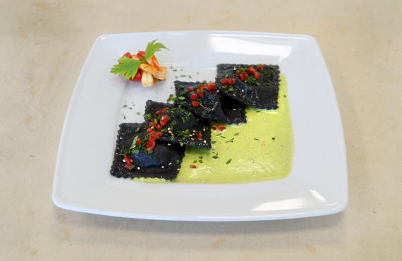 CORSO CUOCO | PRIMO PIATTO RAVIOLI AL NERO DI SEPPIA CON GAMBERI AL LIME SU PUREA DI PISELLI DI SALVATORE TRIDICO DIPLOMATO CORSO DI CUOCO PROFESSIONISTA INGREDIENTI PER 4 PERSONE: